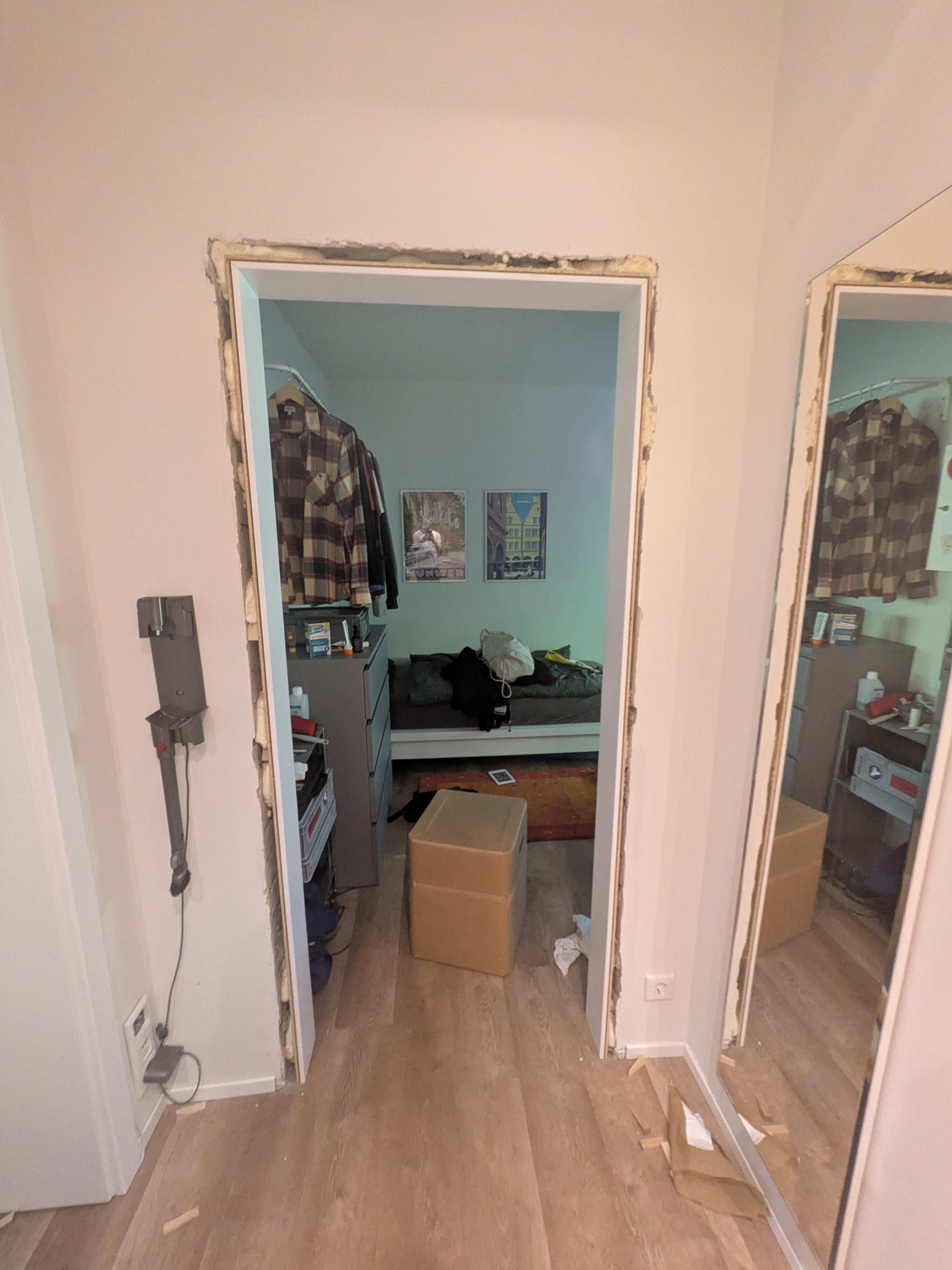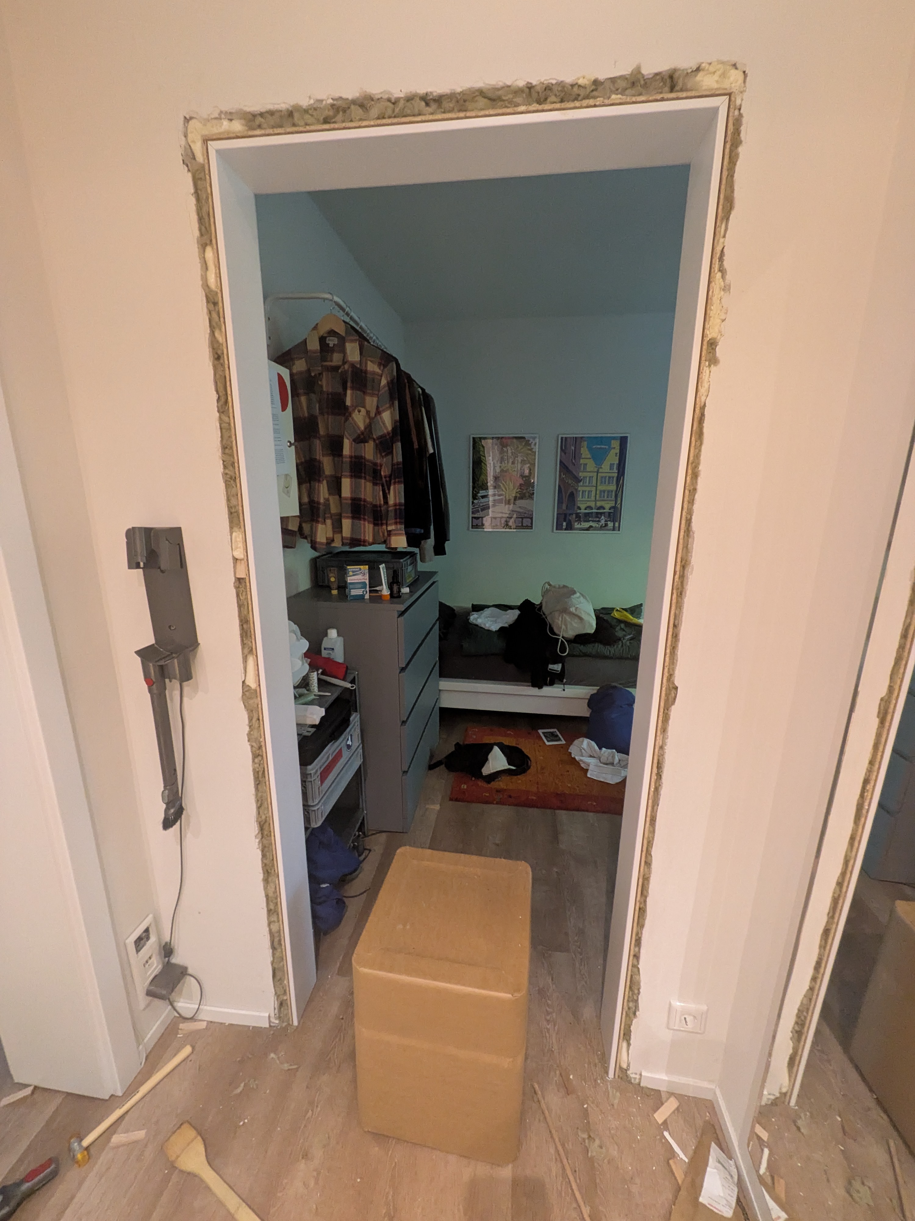 Den Türrahmen zu demontieren war erstaunlich einfach. Man konnte ihn einfach reium abhebeln. Anschließend habe ich knapp eine Stunde damit verbracht alle Zwischenräume gründlich mit Steinwolle zu füllen und den gesamten Rahmen abzuklopfen, bis alles solide und nicht mehr hohl klang. Die Verkleidung wieder anzubringen war dann ein Kinderspiel.
